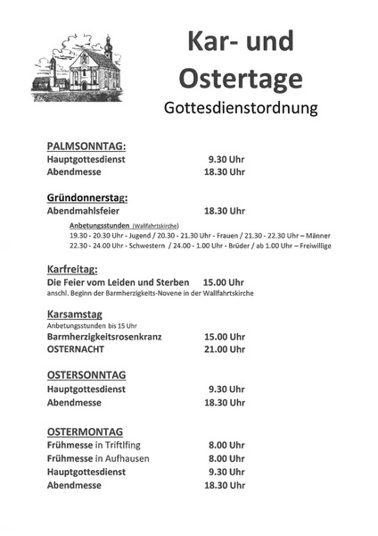 8.00 Frühmesse in Aufhausen für Leb. und Verst. der Familien Wolfart u. Schmitt